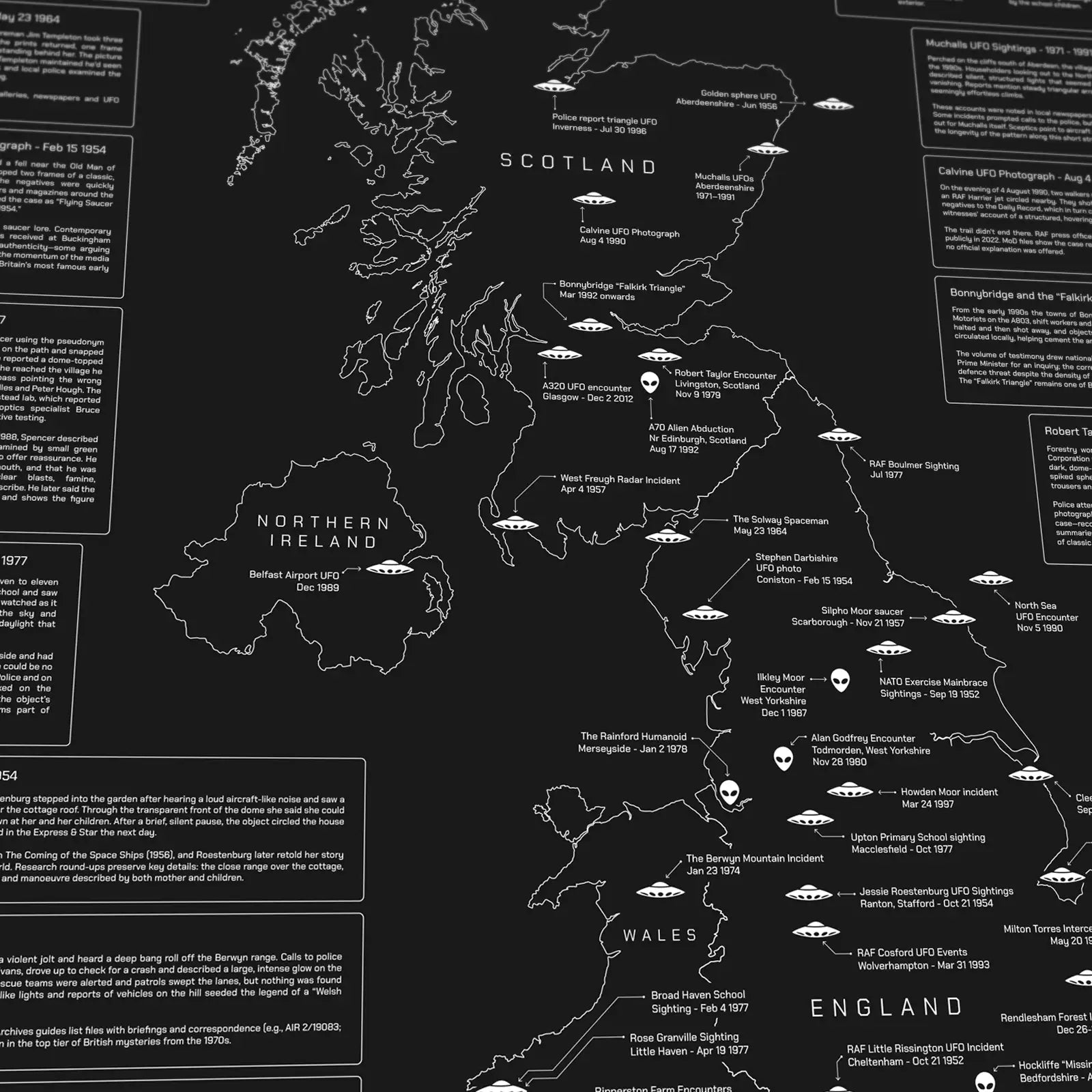 The United Kingdom has a long and curious history of strange sightings and unexplained encounters. This glow-in-the-dark map charts some of the country’s most famous UFO and alien cases, drawn from well-documented sources and reports. Each location is mapped and many of their stories are told — from mass sightings and military encounters to alien abductions and mysterious lights in the forest.