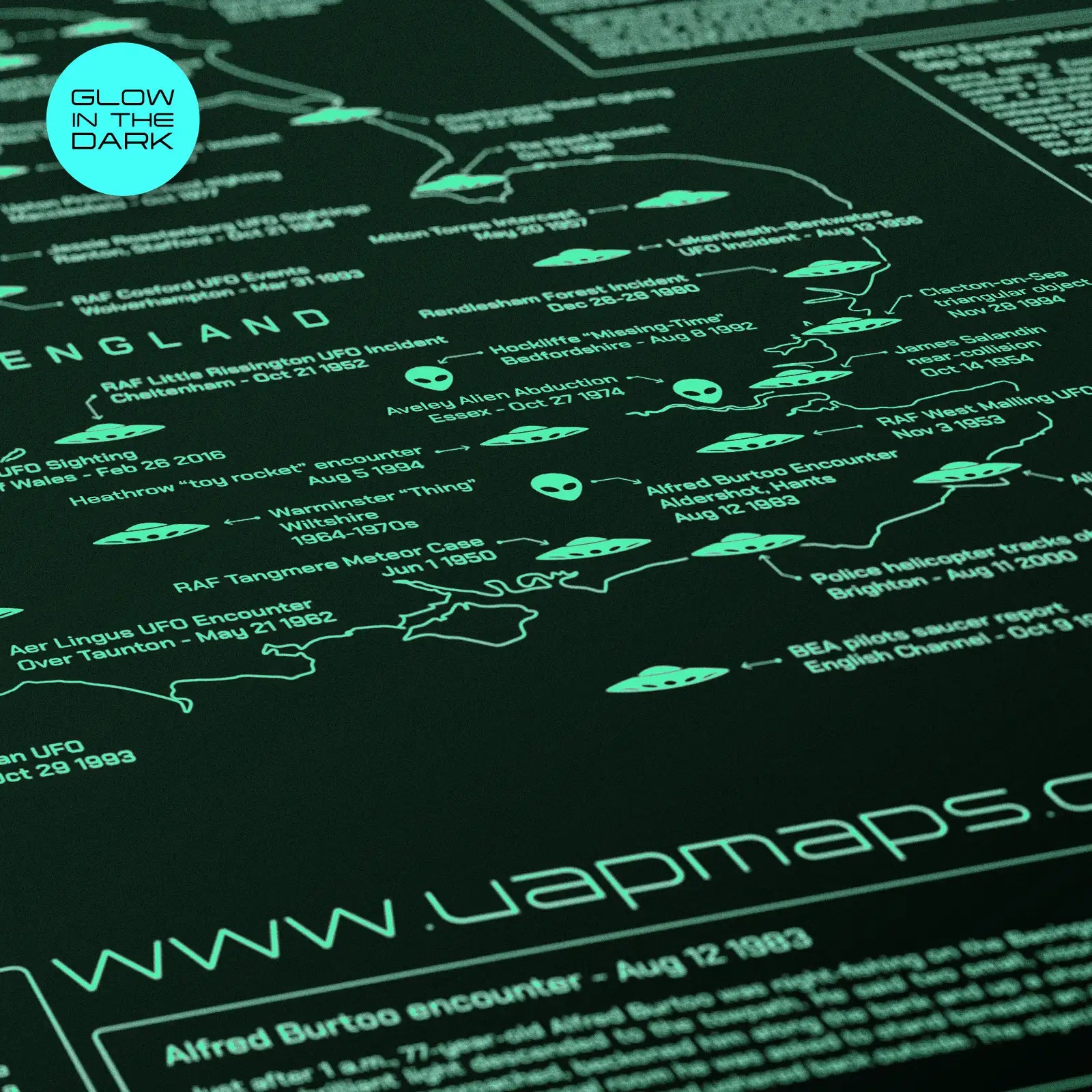 UK UFO & Alien Encounters Map - Glow in the Dark Poster
