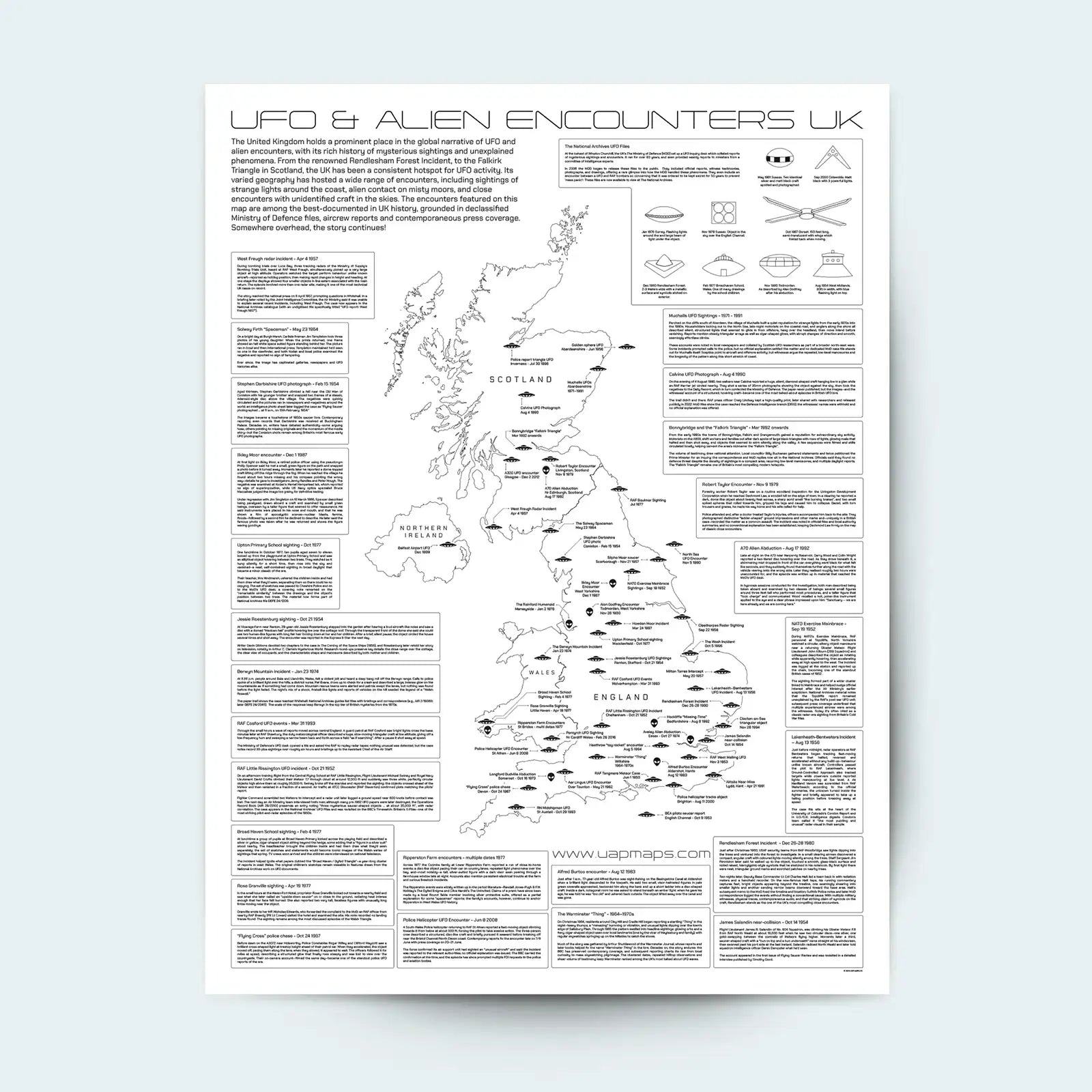 The United Kingdom has a long and mysterious history of UFO sightings and unexplained encounters. This minimalist poster maps many of the country’s most famous cases, drawn from well-documented sources and reports. Each location is marked and some of their stories are included - from mass sightings and military encounters to alien abductions and strange lights in the forest.